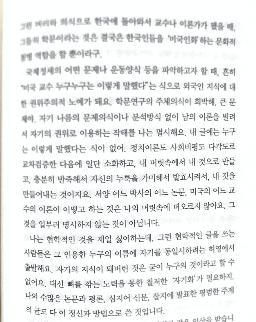 개인적으로 가장 인상깊었던 부분이다. 자신만의 확고한 생각과 철저한 ‘자기화’가 필요하다는 것. 타인의 작품을 덕지덕지 인용해서 짜집기식 결론을 만들어내는 것이 아니라 철저하게 자기것으로 소화하여 자신만의 표현으로 내보일 수 있을 정도의 수준이 되어야 한다고 그는 말한다. 앞으로 내가 글을 작성하거나 공부하고 연구하는 데 있어 가장 새길만한 구절이 아닌가 생각한다.