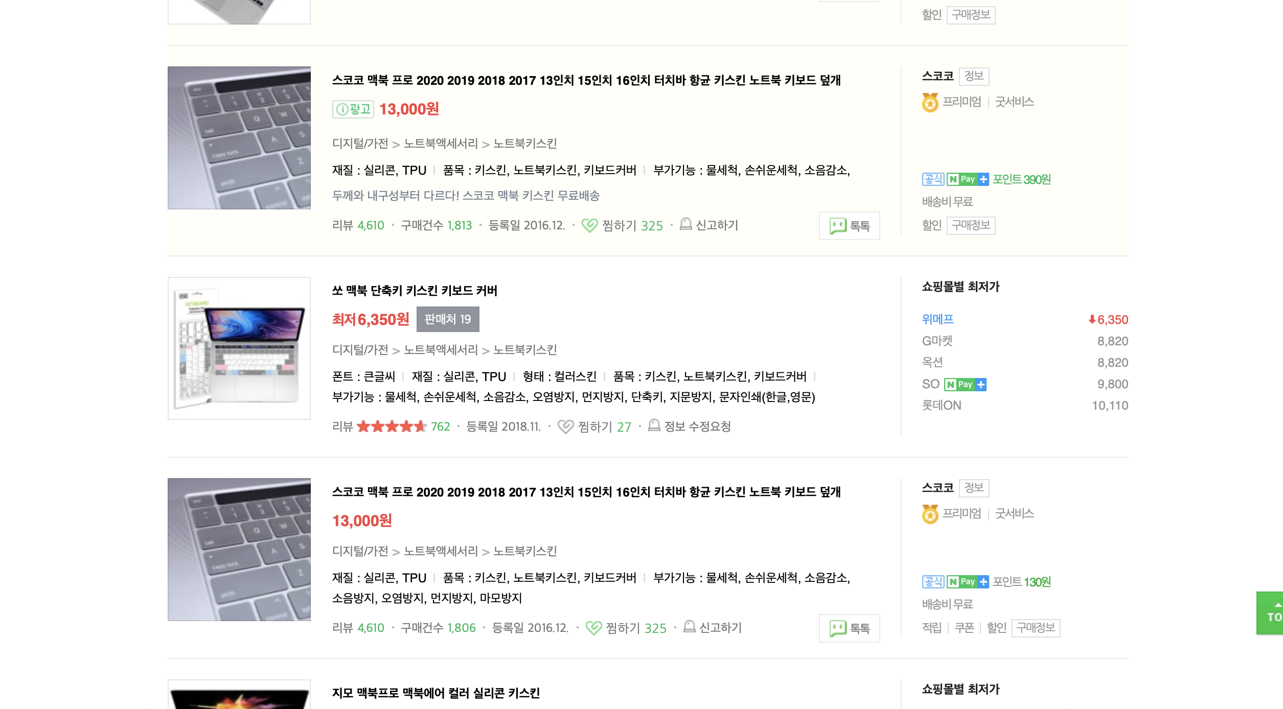 네이버 쇼핑에서 맥북 키스킨을 검색한다음 상위권에 있는 키스킨 중 하나를 골랐다.